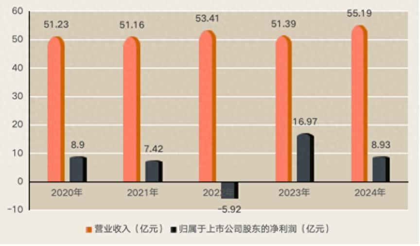 关于业绩,新京报贝壳财经记者注意到,最近五年(2020年至2024年),中炬高新的营业收入在51亿元至56亿元之间徘徊,归属于上市公司股东的净利润普遍处于盈利状态,仅在2022年陷入亏损。